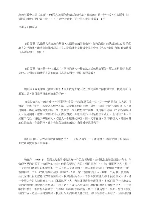 髙效沟通十三招一第四讲沟通第2、3招主讲人:鞠远华节目导视:沟通是人类交流的基础,沟通是情感的催化剂。