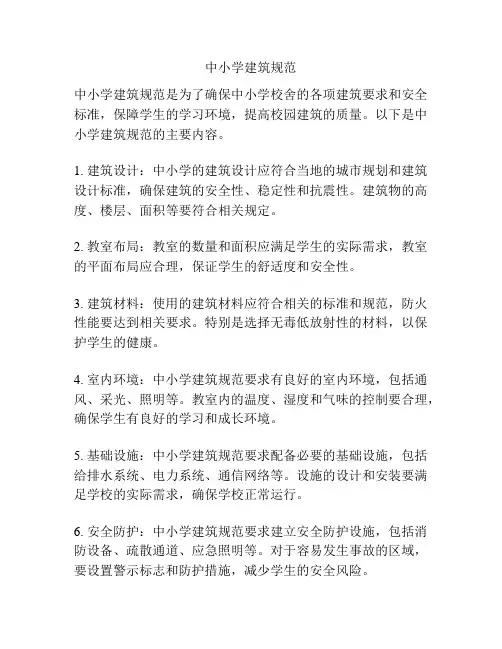中小学建筑设计要求规范2024中小学建筑设计要求规范2024以下是2024年中小学建筑设计要求规范的一些要点:1.规划要求:a.建筑场地面积和功能划分需符合教学、体育、休闲等活动的需求。