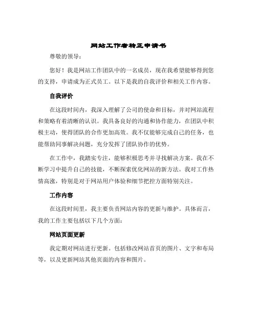 网站工作者转正申请书范文7篇篇1尊敬的领导:您好!我谨以此信表达我强烈的愿望,希望能够正式加入贵公司,成为其中的一员。