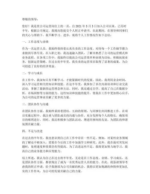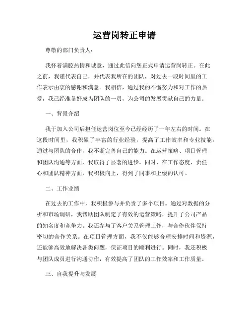 运营岗转正申请尊敬的部门负责人:我怀着满腔热情和诚意,通过此信向您正式申请运营岗转正。