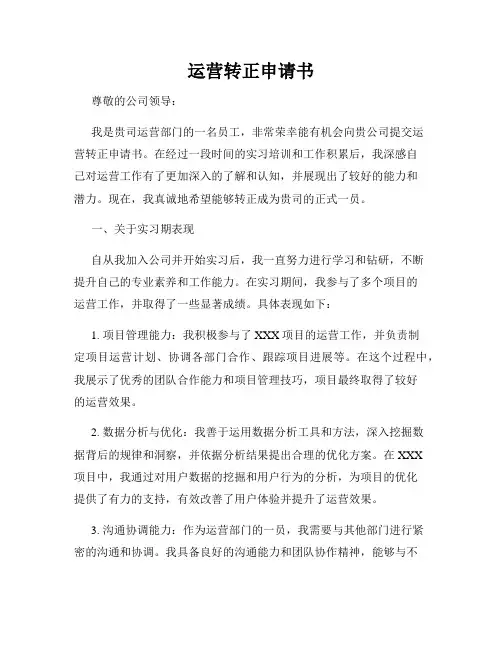 运营转正申请书运营转正申请书1尊敬的领导:我是贵公司电商运营助理岗位的一名员工,非常荣幸有机会向您提交我的转正申请。