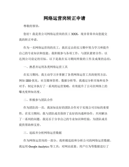 网络运营部门转正申请书尊敬的XXX公司领导:您们好!通过这封申请信,我诚挚地向公司网络运营部门提交我的转正申请。