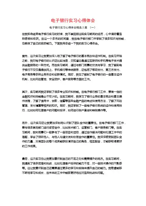 电子银行实习心得体会电子银行实习心得体会精选2篇(一)在我即将结束电子银行实习的时候,我不禁回顾这段实习期间的经历,心中涌动着各种感慨和收获。