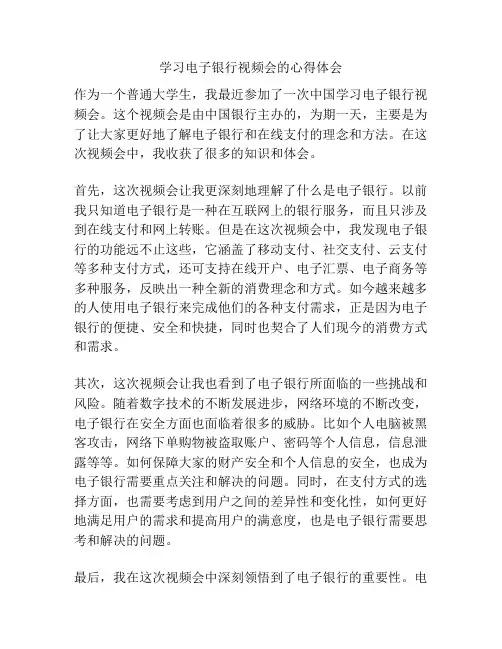 学习电子银行视频会的心得体会作为一个普通大学生,我最近参加了一次中国学习电子银行视频会。