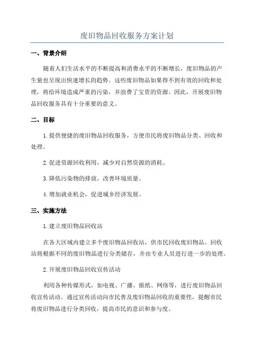 废旧物品回收服务方案一、项目概况本项目为废旧物资回收项目,回收地点为业主各指定位置,项目实施时间为年月日至年月日止。