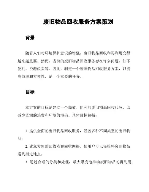 旧物回收策划书范文3篇篇一旧物回收策划书范文一、活动主题让旧物焕发出新的生命二、活动目的1. 提高资源利用率,减少浪费。