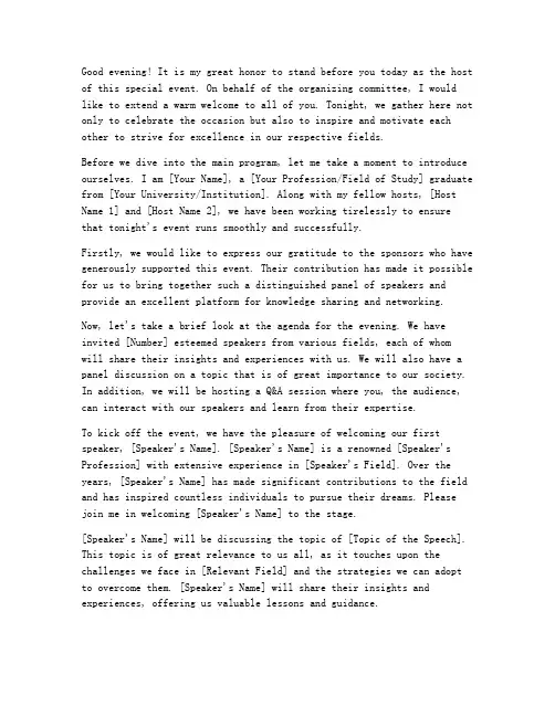 Good evening! It is my great honor to stand before you today as the host of this special event. On behalf of the organizing committee, I would like to extend a warm welcome to all of you. Tonight, we gather here not only to celebrate the occasion but also to inspire and motivate each other to strive for excellence in our respective fields.Before we dive into the main program, let me take a moment to introduce ourselves. I am [Your Name], a [Your Profession/Field of Study] graduate from [Your University/Institution]. Along with my fellow hosts, [Host Name 1] and [Host Name 2], we have been working tirelessly to ensurethat tonight's event runs smoothly and successfully.Firstly, we would like to express our gratitude to the sponsors who have generously supported this event. Their contribution has made it possible for us to bring together such a distinguished panel of speakers and provide an excellent platform for knowledge sharing and networking.Now, let's take a brief look at the agenda for the evening. We have invited [Number] esteemed speakers from various fields, each of whomwill share their insights and experiences with us. We will also have a panel discussion on a topic that is of great importance to our society. In addition, we will be hosting a Q&A session where you, the audience, can interact with our speakers and learn from their expertise.To kick off the event, we have the pleasure of welcoming our first speaker, [Speaker's Name]. [Speaker's Name] is a renowned [Speaker's Profession] with extensive experience in [Speaker's Field]. Over the years, [Speaker's Name] has made significant contributions to the field and has inspired countless individuals to pursue their dreams. Please join me in welcoming [Speaker's Name] to the stage.[Speaker's Name] will be discussing the topic of [Topic of the Speech]. This topic is of great relevance to us all, as it touches upon the challenges we face in [Relevant Field] and the strategies we can adopt to overcome them. [Speaker's Name] will share their insights and experiences, offering us valuable lessons and guidance.As we move forward, we will have a brief intermission during which you can grab some refreshments and network with fellow attendees. This is an excellent opportunity to exchange ideas, forge new connections, and explore potential collaborations.After the intermission, we will continue with the second speaker, [Speaker's Name]. [Speaker's Name] is a [Speaker's Profession] with a passion for [Speaker's Field]. [Speaker's Name] has dedicated their career to [Speaker's Achievements], and their work has had a profound impact on [Relevant Field]. Let's give a warm welcome to [Speaker's Name].[Speaker's Name] will be addressing the topic of [Topic of the Speech]. This topic is particularly relevant in today's fast-paced world, as it focuses on the importance of [Relevant Aspect]. [Speaker's Name] will share their thoughts and experiences, providing us with valuableinsights and practical advice.As we reach the midpoint of the program, we will have a short panel discussion on the topic of [Panel Topic]. The panel will consist of [Number] experts from various fields, each bringing their unique perspectives and expertise. This discussion will provide a platform for in-depth analysis and exchange of ideas. Please welcome the panel members to the stage.After the panel discussion, we will move on to the third speaker, [Speaker's Name]. [Speaker's Name] is a [Speaker's Profession] who has dedicated their life to [Speaker's Field]. [Speaker's Name] has made significant strides in [Relevant Aspect], and their work has been recognized both nationally and internationally. Let's give a warm welcome to [Speaker's Name].[Speaker's Name] will be discussing the topic of [Topic of the Speech]. This topic is of great interest to us all, as it focuses on the future of [Relevant Field] and the potential challenges and opportunities that lie ahead. [Speaker's Name] will share their vision and insights, offering us a glimpse into the future.As we draw near the end of the program, we will have a brief Q&A session where you, the audience, can ask questions to our speakers. This is an excellent opportunity to clarify any doubts you may have and learn from the experts. Please make sure to come prepared with your questions.Before we conclude the event, I would like to take a moment to thank all the speakers, sponsors, and volunteers who have made this evening possible. Your dedication and commitment have contributed to the success of this event.In conclusion, tonight's event has been a fantastic opportunity for us to learn, grow, and connect with like-minded individuals. We hope that the insights and knowledge shared by our speakers will inspire and motivate us to pursue our goals and make a positive impact on the world.Once again, thank you all for joining us tonight. We hope that you have enjoyed the evening and found the sessions to be informative andthought-provoking. Please feel free to continue networking and exchanging ideas during the reception that follows.Thank you, and good night.[Your Name]。