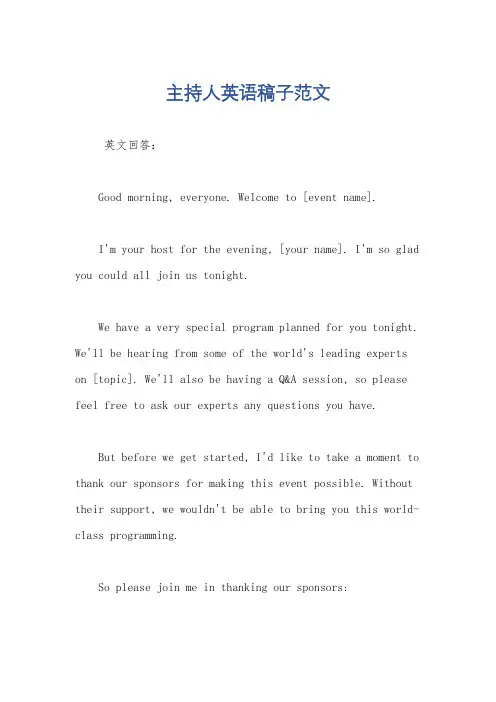 主持人英语稿子范文英文回答:Good morning, everyone. Welcome to [event name].I'm your host for the evening, [your name]. I'm so glad you could all join us tonight.We have a very special program planned for you tonight. We'll be hearing from some of the world's leading experts on [topic]. We'll also be having a Q&A session, so please feel free to ask our experts any questions you have.But before we get started, I'd like to take a moment to thank our sponsors for making this event possible. Without their support, we wouldn't be able to bring you this world-class programming.So please join me in thanking our sponsors:[Sponsor name][Sponsor name][Sponsor name]Thank you again to our sponsors. Now, let's get started with the program.中文回答:大家好,欢迎来到[活动名称]。