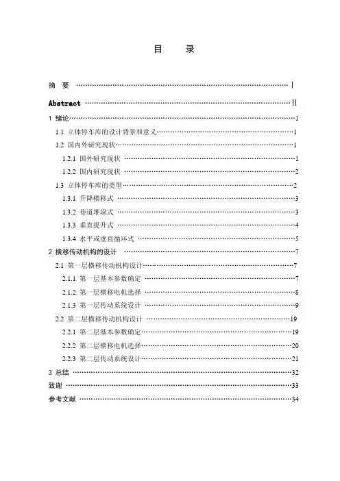 目 录摘 要 (2)ABSTRACT (3)1 绪论 (4)1.1 机械式立体车库设计概论 (5)1.1.1术语定义 (5)1.1.2机械车库类型定义 (6)1.2机械式立体停车设备 (6)1.2.1停车设备特性 (6)1.2.2停车设备设计要求 (7)1.2.3停车设备安全要求 (8)1.2.4设备种类 (9)2 升降传动机构设计与计算 (12)2.1电动机选择 (12)2.2起升部件的计算选取 (12)2.2.1钢丝绳的选取 (12)2.2.2卷筒尺寸的确定 (13)2.3传动系统计算 (15)2.3.1传动比I的确定 (15)2.3.2减速器的选择 (15)2.3.3大小链轮的选择计算 (17)2.4轴及轴承的选择、强度计算与校核 (23)2.4.1轴的选择、强度计算与校核 (23)2.4.2轴承的选择、强度计算与校核 (26)2.5键的选择与校核 (27)2.6联轴器的选择 (28)2.7装配图 (29)3 结束语 (30)致谢 (31)参考文献 (32)摘 要随着我国城市化进程的加快和汽车产业的迅速发展,建筑设计中关于城市停车 场、停车库的合理设计是相关专业领域亟需解决的课题。