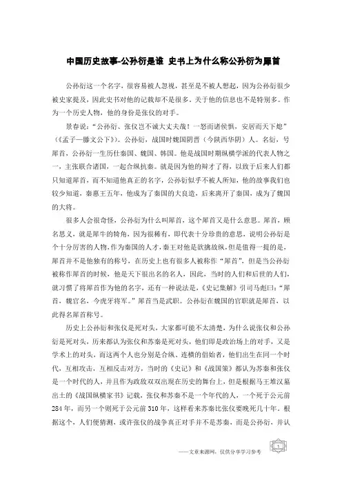 中国历史故事-公孙衍是谁史书上为什么称公孙衍为犀首公孙衍这一个名字,很容易被人忽视,甚至是不被人想起,因为公孙衍很少被史家提及,因此史书对他的记载却不是很多。