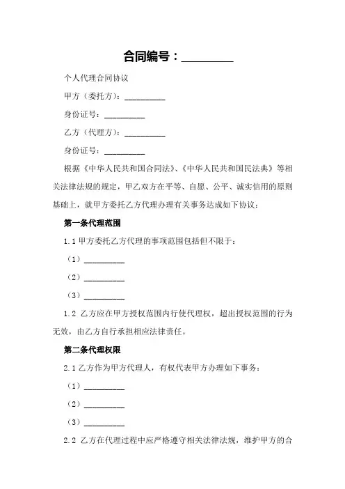 合同编号:__________个人代理合同协议甲方(委托方):__________身份证号:__________乙方(代理方):__________身份证号:__________根据《中华人民共和国合同法》、《中华人民共和国民法典》等相关法律法规的规定,甲乙双方在平等、自愿、公平、诚实信用的原则基础上,就甲方委托乙方代理办理有关事务达成如下协议:第一条代理范围1.1甲方委托乙方代理的事项范围包括但不限于:(1)__________(2)__________(3)__________1.2乙方应在甲方授权范围内行使代理权,超出授权范围的行为无效,由乙方自行承担相应法律责任。