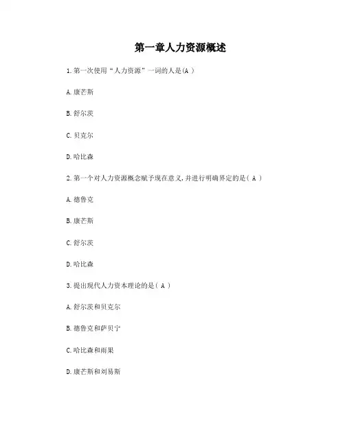 第一章人力资源概述1.第一次使用“人力资源”一词的人是(A )A.康芒斯B.舒尔茨C.贝克尔D.哈比森2.第一个对人力资源概念赋予现在意义,并进行明确界定的是( A )A.德鲁克B.康芒斯C.舒尔茨D.哈比森3.提出现代人力资本理论的是( A )A.舒尔茨和贝克尔B.德鲁克和萨贝宁C.哈比森和雨果D.康芒斯和刘易斯4.我国研究人力资源的学者中,主张从能力角度出发解释人力资源含义的是(A )A.张德、朱舟、陆国泰、萧鸣政、郭洪林等B.张德、陈运敦、陈全明等C.朱舟、郭晓明等D.陆国泰、萧鸣政、于桂兰、魏燕等5.我国计算人力资源时,所依据的现行年龄是(A )A.男性16-60岁,女性16-55岁B.男性14-60岁,女性14-55岁C.男性18-60岁,女性18-55岁D.男性16-65岁,女性16-60岁6.不属于影响人力资源的数量因素的是( D )A.人口的总量B.人口的年龄结构C.人口迁移D.人们的就业意愿7.不属于衡量一国或地区的人口质量的因素是(D )A.体质水平B.文化水平(包括专业技术水平)C.心理素质和道德情操D.实际参加工作的人力资源数量8.不能反映人力资源质量的因素是(A )A.可以推动物质资源的人的规模B.可以推动物质资源的人的类型C.可以推动物质资源的人的复杂程度D.可以推动物质资源的人的数量9.人才资源:一个国家或地区中最具有较学科知识,较强劳动技能,在价值创造过程中起关键作用或重要作用的那部分人,人才资源是人力资源的一部分,即优质的人力资源。