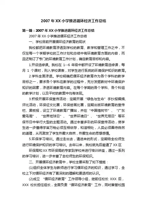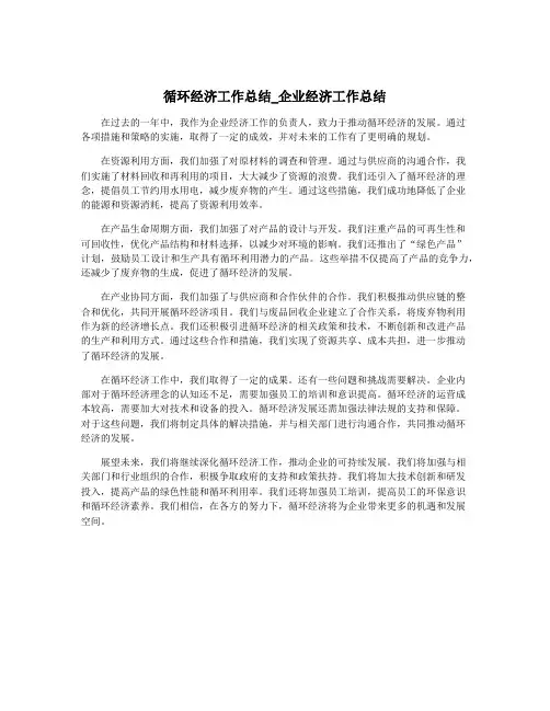 循环经济工作总结一、引言循环经济是指在资源有限的前提下,通过循环再利用、减少资源消耗和废弃物排放,实现经济、社会和环境的可持续发展。