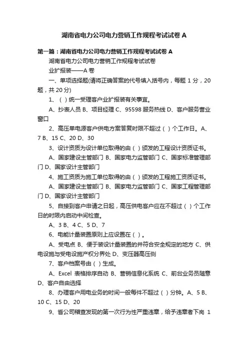 A.1人 B.2人 C. 3人 D. 4人湖南省电力公司电力营销工作规程考试试题 6、自助缴费应( A )对自助缴费终端收取的电费进行解款、对账A.每日 B.每月 C.每周 D. 每个工作日收费账务——A卷7、某单位催费员对专变客户进行催费,电费通知单应在电费发行后(C)内送达,题号一二三四五合计统分人签收单应存档备查。