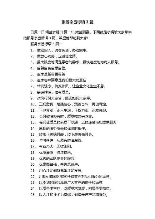 下⾯是⽆忧考整理发布的“服务⾏业理念标语三篇”,欢迎阅读参考!更多相关讯息请关注⽆忧考!【篇⼀】服务⾏业理念标语 1、品质是⽣命,服务是宗旨。