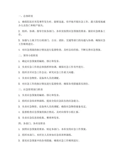 一、总体职责1. 确保医院在突发事件发生时,能够迅速、有序地开展应急工作,最大限度地减少人员伤亡和财产损失。