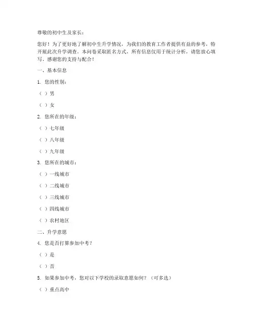 感谢您的支持与配合!一、基本信息1. 您的性别是:()男()女2. 您所在的年级是:()七年级()八年级()九年级3. 您所在的班级是:___________________二、学习适应性4. 您对初中学习的整体适应情况如何?()非常适应()比较适应()一般()不太适应()完全不适应5. 您觉得初中课程与小学相比,难度如何?()难度很大()难度较大()难度适中()难度较小()难度很小6. 您在初中学习中遇到的主要困难有哪些?(可多选)()学习科目多()学习压力大()学习方法不适应()课堂注意力不集中()家庭作业多()其他___________________7. 您如何应对学习中的困难?(可多选)()请教老师()向同学求助()自己独立思考()家长辅导()其他___________________三、生活适应性8. 您对初中生活的整体适应情况如何?()非常适应()比较适应()一般()不太适应()完全不适应9. 您觉得初中生活与小学相比,有哪些不同之处?(可多选)()作息时间调整()课程安排()同学关系()课外活动()其他___________________10. 您在初中生活中遇到的主要困难有哪些?(可多选)()生活习惯改变()人际关系处理()生活自理能力不足()其他___________________11. 您如何应对生活中的困难?(可多选)()向老师、同学寻求帮助()自己调整心态()家长关心与支持()其他___________________四、心理适应性12. 您在初中生活中,遇到心理压力时,会采取哪些方式应对?(可多选)()与朋友聊天()进行体育锻炼()听音乐、看电影()写日记()家长、老师辅导()其他___________________13. 您认为自己在心理上是否适应了初中生活?()非常适应()比较适应()一般()不太适应()完全不适应14. 您对学校心理健康教育资源的了解程度如何?()非常了解()比较了解()一般()不太了解()完全不了解五、其他建议15. 您对学校在帮助同学们适应初中生活方面有哪些建议?___________________感谢您的参与!请您在填写问卷时,尽量做到客观、真实。