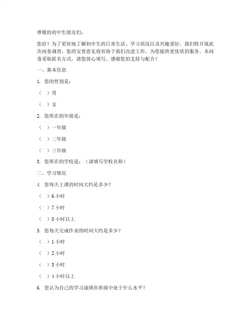 感谢您的参与!一、基本信息1. 性别:(1)男(2)女2. 年级:(1)七年级(2)八年级(3)九年级3. 班级:二、兴趣爱好4. 您最喜欢的运动项目是?(1)篮球(2)足球(3)乒乓球(4)羽毛球(5)游泳(6)其他(请说明)5. 您最喜欢的音乐类型是?(1)流行音乐(2)摇滚音乐(3)古典音乐(4)民族音乐(5)其他(请说明)6. 您最喜欢的电影类型是?(1)动作片(2)喜剧片(3)爱情片(4)科幻片(5)纪录片(6)其他(请说明)7. 您最喜欢的书籍类型是?(1)小说(2)散文(3)科普(4)历史(5)漫画(6)其他(请说明)8. 您最喜欢的课外活动是?(1)参加社团活动(2)参加志愿者活动(3)参加兴趣小组(4)观看电影(5)阅读书籍(6)其他(请说明)三、学习与生活9. 您认为自己的学习成绩?(1)优秀(2)良好(3)一般(4)较差10. 您每天用于学习的时间大约是多少?(1)1-2小时(2)2-3小时(3)3-4小时(4)4小时以上11. 您认为自己在以下方面需要改进?(1)学习习惯(2)学习方法(3)时间管理(4)人际交往(5)其他(请说明)12. 您认为自己在以下方面做得较好?(1)学习习惯(2)学习方法(3)时间管理(4)人际交往(5)其他(请说明)四、其他13. 您认为学校在以下方面需要改进?(1)课程设置(2)教学方法(3)课外活动(4)校园环境(5)其他(请说明)14. 您对学校的整体满意度?(1)非常满意(2)满意(3)一般(4)不满意15. 您对本次调查问卷的建议和意见?(请在此处填写)感谢您的参与!祝您学习进步,生活愉快!问卷填写完毕后,请将问卷交给班主任或指定的收卷人员。