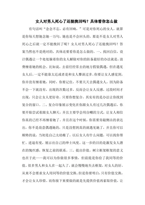 女人死心了还能挽回吗之冷冻技巧女人死心了还能不能挽回?我想告诉你的答案是,只要你和她都还在这个世界上,只要你能按照步骤一步一步去执行,都能挽回。