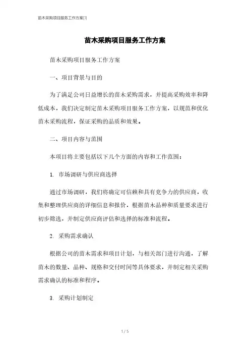 苗木采购项目服务工作方案苗木采购项目服务工作方案一、项目背景与目的为了满足公司日益增长的苗木采购需求,并提高采购效率和降低成本,我们决定制定苗木采购项目服务工作方案,以规范和优化苗木采购流程,保证采购的品质和效果。
