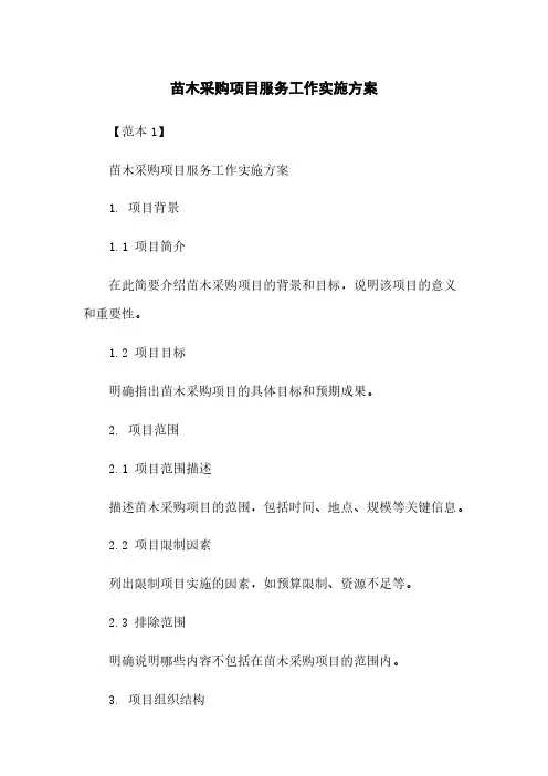 ----------------------------------------------------------范本2:苗木采购方案一、引言1.1 项目背景1.2 目的和意义二、需求分析2.1 苗木品种和数量2.1.1 补充苗木需求2.1.2 确定苗木种类及数量 2.2 苗木规格和质量要求2.2.1 确定苗木规格2.2.2 制定苗木质量标准三、供应商选择3.1 供应商调研3.1.1 收集供应商信息3.1.2 评估供应商实力3.2 供应商评审3.2.1 确定评审标准3.2.2 开展供应商评审四、价格谈判与成本分析4.1 报价要求4.1.1 确定采购预算4.1.2 发布报价要求4.2 价格谈判4.2.1 与供应商进行价格谈判4.2.2 确定最终价格五、合同签订与履约管理5.1 合同条款5.1.1 确定合同要素5.1.2 编写合同文本5.2 履约管理5.2.1 监督供应商履约情况5.2.2 处理合同履约问题六、风险管理6.1 供应商风险6.1.1 评估供应商信誉度6.1.2 应对潜在供应商风险6.2 质量风险6.2.1 设定苗木质量验收标准6.2.2 执行苗木质量检验七、附件:供应商调研表、成本分析表、合同示例法律名词及注释:1. 供应商调研:对各个供应商进行调查和评估,以确定其能力和信誉情况。