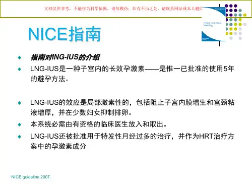 左炔诺孕酮宫内节育器说明书【药品名称】左炔诺孕酮宫内节育系统【英文名】Levonorgestrel intrauterine system【商品名】曼月乐【汉语拼音】Zuo que nuo yun tong gong nei jie yu xi tong【主要成分】本品主要成份为左炔诺孕酮,其化学名称为:D(-)-17α-乙炔基-17β-羟基-18-甲基雌甾-4-烯-3-酮【结构式】【分子式】C 21H28 O2【分子量】312.4【性状】本品为白色至类白色筒状物,架在T状体上,外罩不透明的套管。