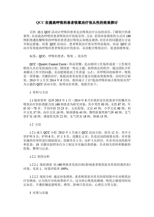 QCC在提高呼吸科患者吸氧治疗依从性的效果探讨目的通过QCC活动让呼吸科患者走出吸氧治疗认知的误区,了解氧疗的重要性,从而提高呼吸科患者吸氧治疗的依从性。