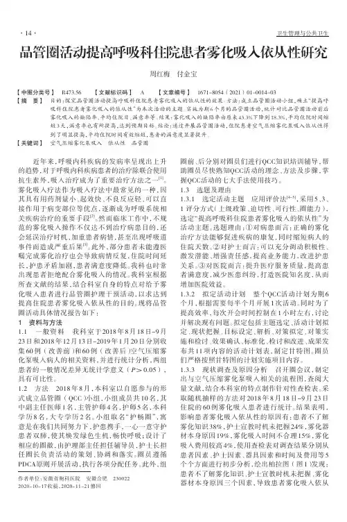 卫生管理与公共卫生·14·品管圈活动提高呼吸科住院患者雾化吸入依从性研究周红梅 付金宝【中图分类号】 R473.56 【文献标识码】 A 【文章编号】 1671-8054(2021)01-0014-03【摘 要】 目的:探究品管圈活动提高呼吸科住院患者雾化吸入的依从性的效果。