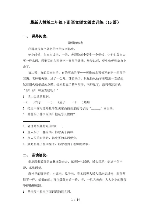 部编版二年级语文下册第八单元主题阅读一、阅读短文,完成练习。