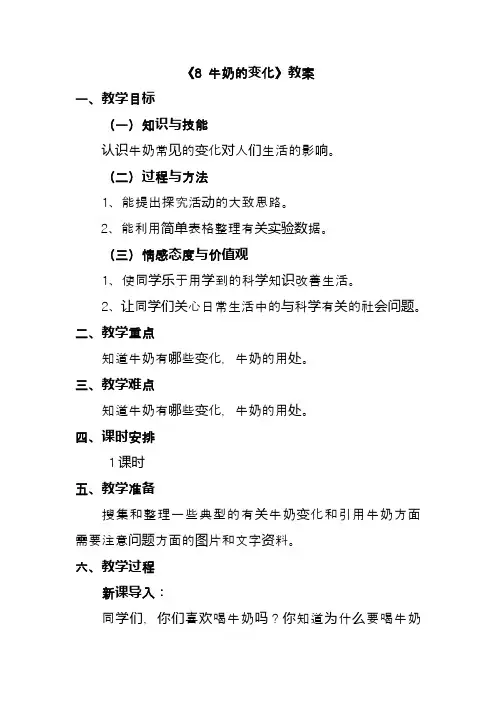 《牛奶的变化》教学设计教学内容:六年级上册第二单元第8课教材分析:牛奶是生活中常见的一种物质,在不同的条件下,它会有多种变化。