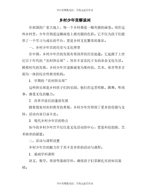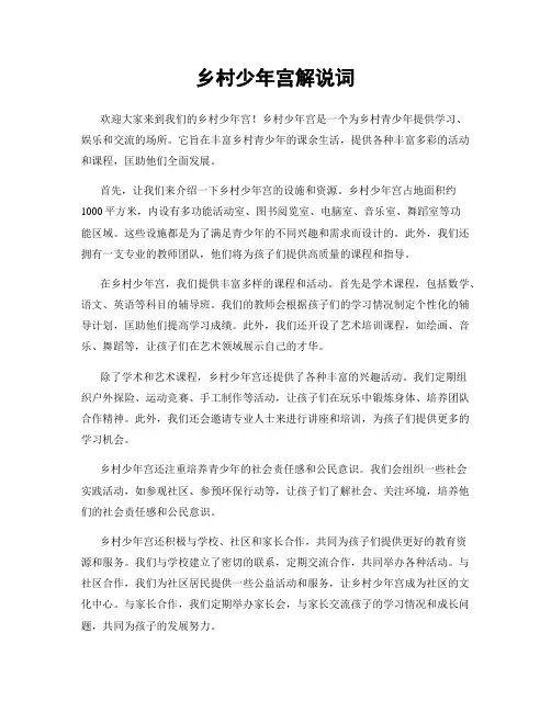 乡村少年宫解说词乡村少年宫是一个为农村地区的青少年提供教育、文化和娱乐活动的综合性机构。