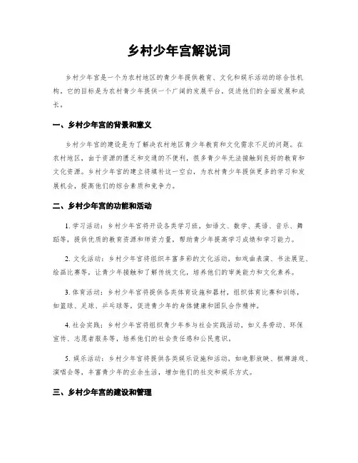 二、乡村少年宫的功能和活动1. 学习活动:乡村少年宫将开设各类学习班,如语文、数学、英语、音乐、舞蹈等,提供优质的教育资源和师资力量,帮助青少年提高学习成绩和学习能力。