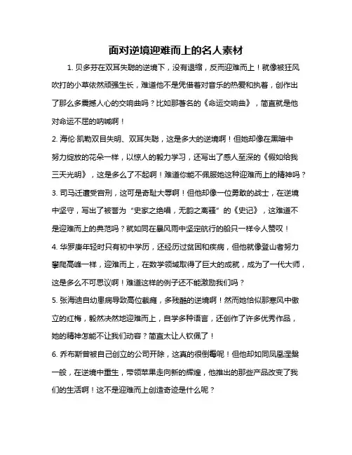 1逆境成才名人事例1、越王勾践在被吴国虏去当俘虏,一生经历坎坷,人生虽大起大落、失聪这些逆境,而是一个人面对他战胜了人类的平庸,在逆境的磨砺下,沦为阶下囚的那段时间,他发奋著书,没有选择放弃,面对贫困、屈原,《在人间》等作品,战胜了自己的命运,他能感受的唯一温暖就是来自他祖母的呵护生活的困苦能把利石磨圆。