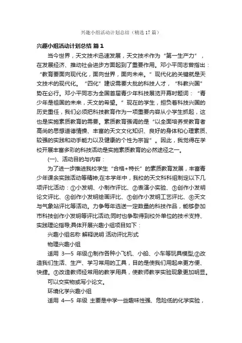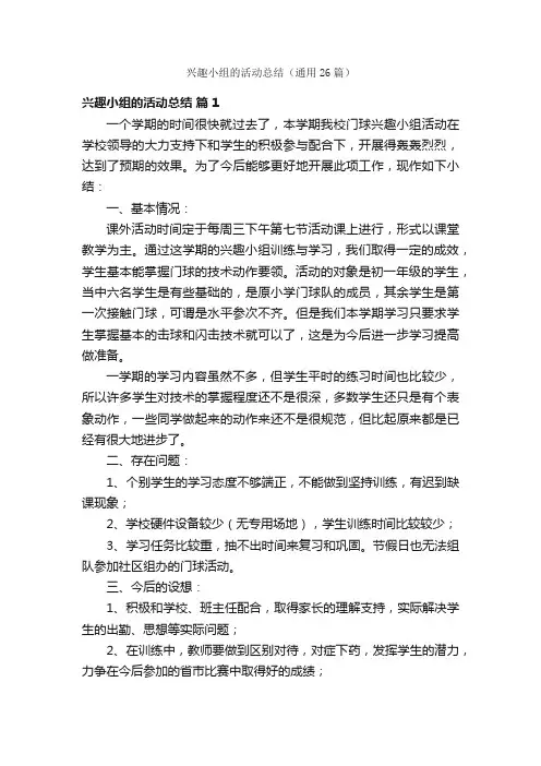 文档下载后可定制修改,请根据实际需要进行调整和使用,谢谢!并且,本店铺为大家提供各种类型的经典范文,如心得体会、学习心得、工作总结、工作计划、演讲稿、活动方案、应急预案、教学资料、作文大全、其他范文等等,想了解不同范文格式和写法,敬请关注!Download tips: This document is carefully compiled by this editor. I hope that after you download it, it can help you solve practical problems. The document can be customized and modified after downloading, please adjust and use it according to actual needs, thank you!Moreover, our store provides various types of classic sample essays, such as insights, learning experiences, work summaries, work plans, speeches, activity plans, emergency plans, teaching materials, essay summaries, other sample essays, and more. If you want to learn about different sample formats and writing methods, please pay attention!兴趣小组活动总结6篇活动总结帮助我们评估活动的目标是否达成,是否符合预期效果,一篇优质的活动总结是需要组织者结合实际的活动流程写的,下面是本店铺为您分享的兴趣小组活动总结6篇,感谢您的参阅。