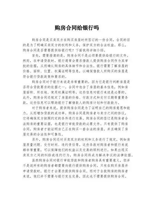 购房合同给银行吗购房合同是买卖双方在购买房屋时所签订的一份合同,合同的目的是为了明确买卖双方的权利和义务,保护双方的合法权益。