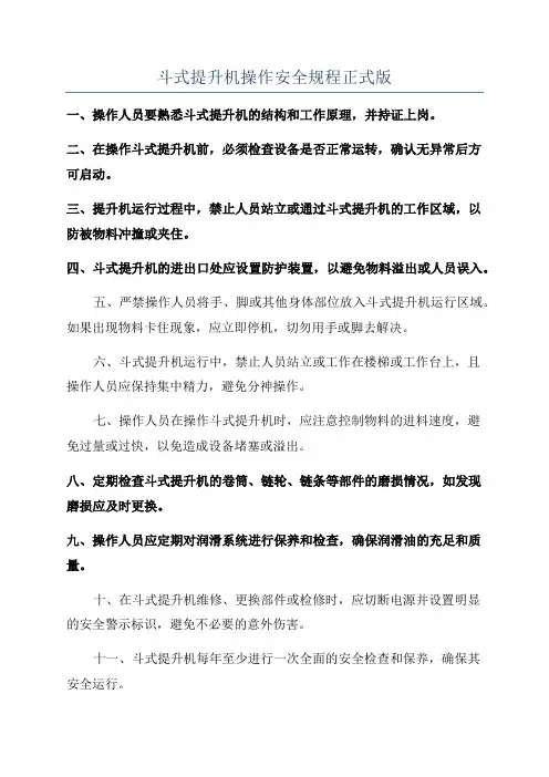 斗式提升机的安全操作规程及使用注意事项范本斗式提升机是一种用于垂直运输物料的重要设备,为了确保工作人员的人身安全和提升机的正常运行,以下是对斗式提升机的安全操作规程及使用注意事项的范本:安全操作规程:1. 使用本斗式提升机的操作人员应接受相关的培训,了解提升机的工作原理、操作规程和安全操作要求。