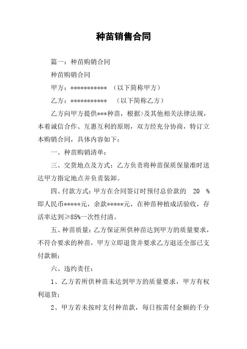 种苗销售合同篇一:种苗购销合同种苗购销合同甲方:*********** (以下简称甲方)乙方:*********** (以下简称乙方)乙方向甲方提供***种苗,根据>及其他相关法律法规,本着诚信合作、互惠互利的原则,双方经充分协商,特订立本购销合同,具体内容如下:一、种苗购销清单:三、交货地点及方式:乙方负责将种苗保质保量准时送达甲方指定地点并负责装卸。