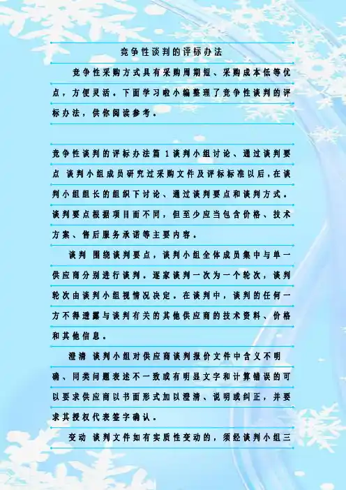 竞争性谈判的评标办法竞争性谈判的评标办法篇1谈判小组讨论、通过谈判要点谈判小组成员研究过采购文件及评标标准以后,在谈判小组组长的组织下讨论、通过谈判要点和谈判方式。