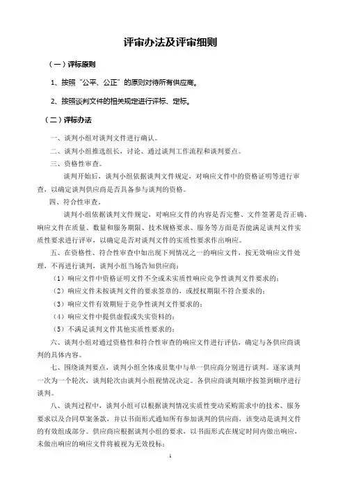 竞争性谈判评标办法及定标原则----------------------------精品word文档值得下载值得拥有----------------------------------------------竞争性谈判评标办法及定标原则一、评标办法采用的评标方式: 最低评标价法二、评标方法及程序:(一)、贵州普诚正华工程造价事务所有限公司,谈判主持人:何芳 (二)、谈判小组组成:1、采购人代表1人2、有关专家4人(三)、监督机构:(四)、谈判步骤:1、第一轮审查投标供应商的投标文件,投标文件报价为供应商第一次报价。
