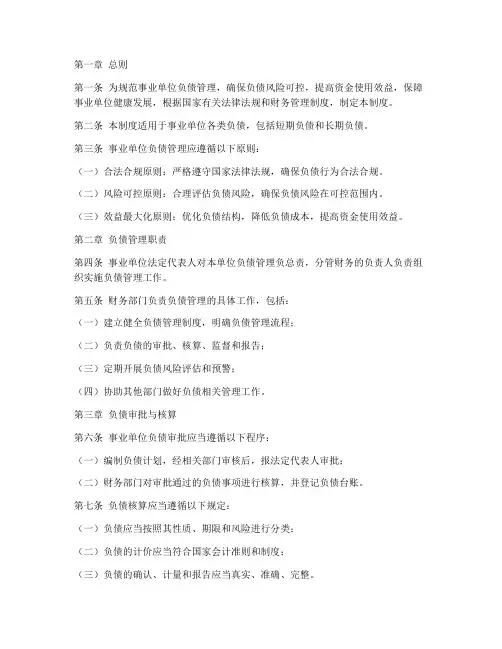 第一章总则第一条为规范事业单位负债管理,确保负债风险可控,提高资金使用效益,保障事业单位健康发展,根据国家有关法律法规和财务管理制度,制定本制度。