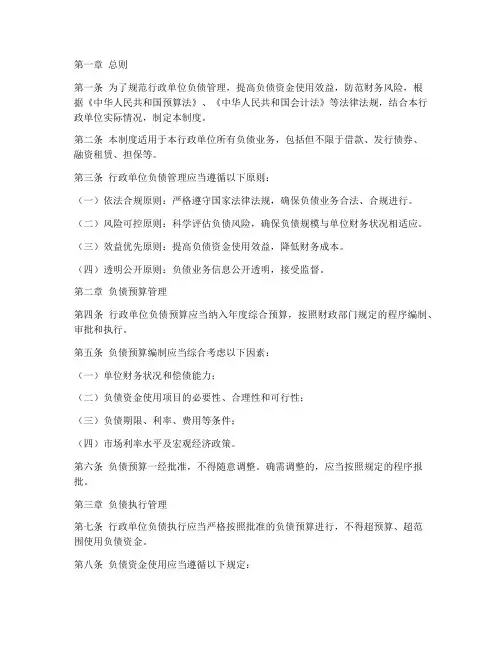 第一章总则第一条为了规范行政单位负债管理,提高负债资金使用效益,防范财务风险,根据《中华人民共和国预算法》、《中华人民共和国会计法》等法律法规,结合本行政单位实际情况,制定本制度。