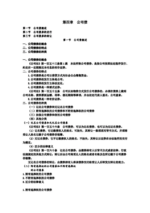 第四章公司债第一节公司债概述第二节公司债券的发行第三节公司债券的转让第一节公司债概述一、公司债券的概念二、公司债券的特点三、公司债券的种类一、公司债券的概念《公司法》第一百五十三条第1款本法所称公司债券,是指公司依照法定程序发行、约定在一定期限还本付息的有价证券。