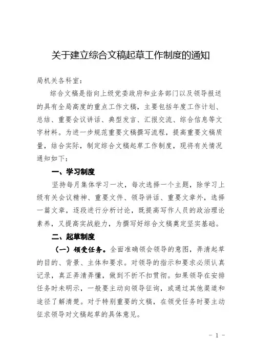关于建立综合文稿起草工作制度的通知局机关各科室:综合文稿是指向上级党委政府和业务部门以及领导报送的具有全局高度的重点工作文稿,主要包括年度工作计划、总结、重要会议讲话、典型发言、汇报交流、综合信息等文字材料。