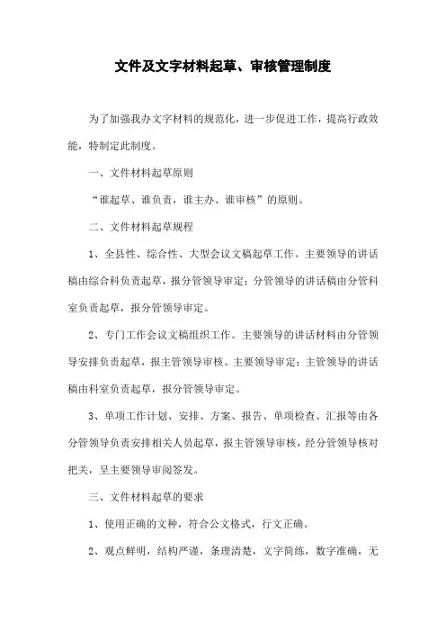 重要文稿起草审核工作制度1. 引言本文档旨在规范和指导重要文稿起草审核工作,确保文稿的质量和准确性,保障公司形象和利益。
