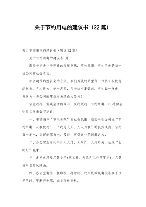 关于节约用电的建议书(32篇)关于节约用电的建议书(精选32篇)关于节约用电的建议书篇1勤俭节约是中华民族的传统美德,节约能源、节约用电是每一位公民的社会责任。