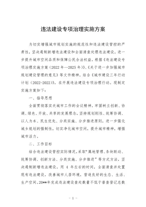 违法建设查处实施方案违法建设是指未经审批或者超越审批范围,在未取得建设工程规划许可证、建设工程施工许可证、建设工程竣工验收合格证书等相关证明文件的情况下,擅自进行建设活动的行为。