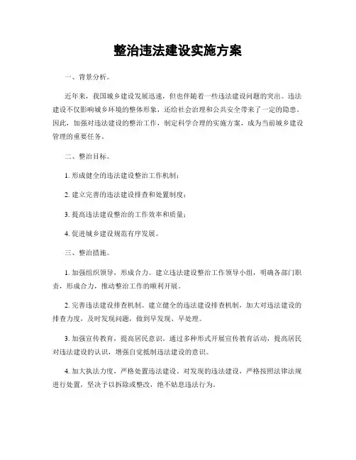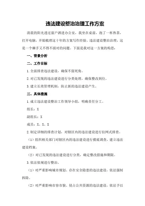 下面是我对这一方案的构思:一、背景分析二、工作目标1.全面排查违法建设,确保不留死角。