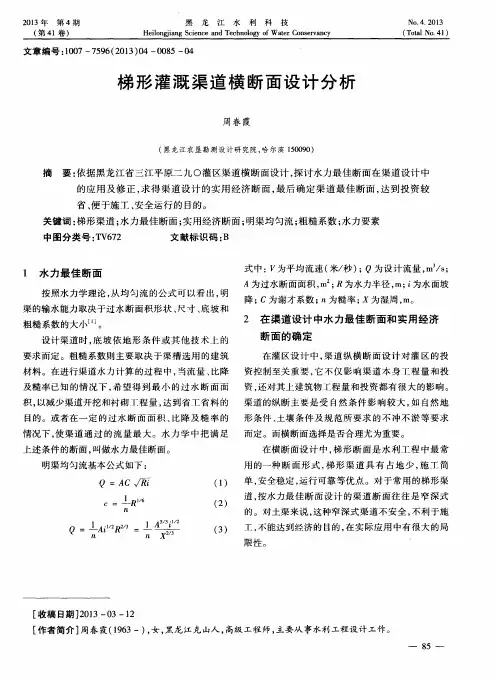 二、最佳水力断面和实用经济断面渠道纵横断面的设计在灌溉区设计中有着不可替代的作用,渠道本身工程量的多少以及投资的多少,都和它有直接的关系。