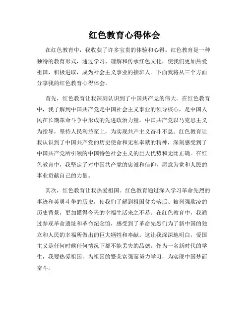 红色教育心得体会在红色教育的熏陶下,我深刻体会到了革命先烈们的伟大牺牲和无私奉献精神,同时也感受到了红色教育对于培养爱国爱党情感和塑造正确价值观的重要性。