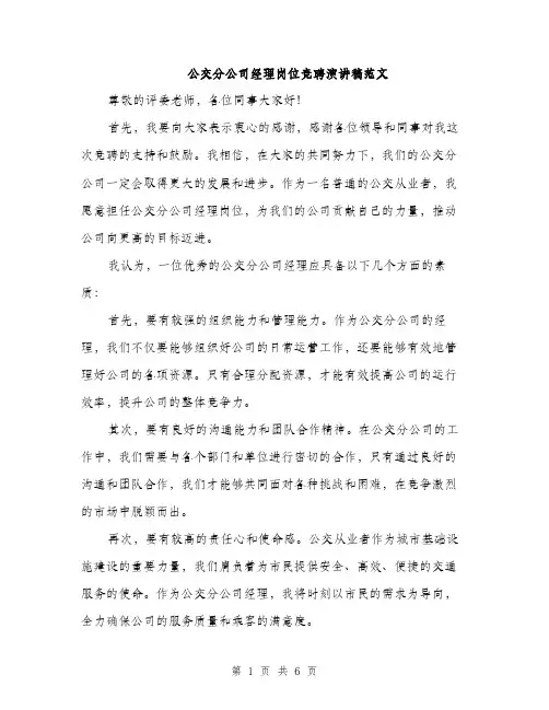 公交分公司经理岗位竞聘演讲稿范文尊敬的评委老师,各位同事大家好!首先,我要向大家表示衷心的感谢,感谢各位领导和同事对我这次竞聘的支持和鼓励。